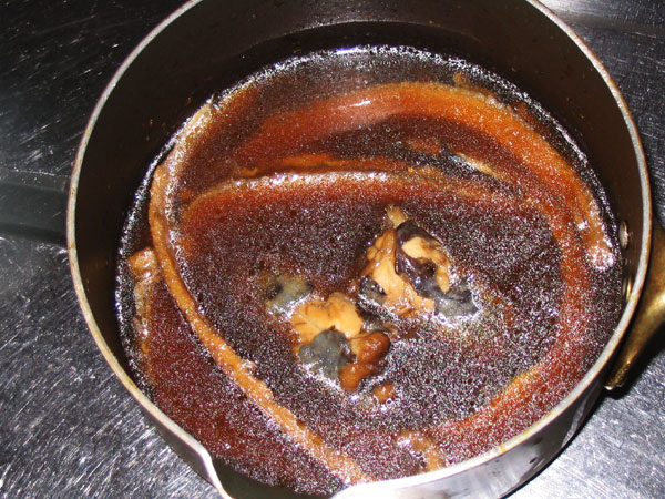 頭と中骨は特に臭くはなかったのでそのまま使い回している詰めに追加して、醤油、みりんを増量して煮詰めた。砂糖で煮てるのだから穴子自体は十分甘い。家で食う詰めくらい、サッパリと辛口でもいいでしょう? 肝はちょいと湯掻いて酒に漬けておくとこれまた最高の摘み。