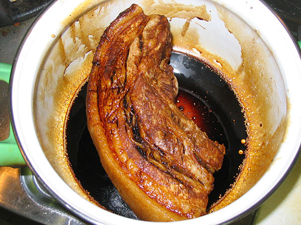 別鍋に3年陳老酒640ml、八角3個(手で割る)、桂皮3本(手で折る)、丁子、花椒、胡椒粒、生姜の皮、まぶした残りと老抽王30ml、普通の丸大豆JAS特級本醸造濃口醤油30ml、氷砂糖30gを沸かす。触れる程度まで肉が冷めたら、3分割程度に切り分ける。皮面以外の各辺をすべて落として直方体に整形するのが本場風だが、そこらで手に入る小さな肉塊でそれをすると貧相にして興醒めなので、後に蒸す器にぎりぎり入る(どうせ縮む)程度が良い。