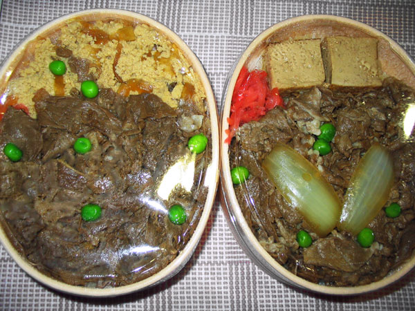 牛丼の起源は明治期の開花丼か? すき焼きの残り肉を白飯に載せたあたりが、葱が玉葱に代わり、彩り緑として三つ葉やグリーンピース、赤い紅生姜を薬味に載せるようになったのだろう。昭和の中ごろ、すき焼きのお持ち帰り用として開発された浅草今半の牛肉弁当なんぞが実は現在の牛丼のオリジナルに近いのかもしれない。今半の牛肉弁当は割り下を使っているのだろう、甘めだが脂の薄い肉に味がしっかりと染みているわりにくどくなく、あっさりとした味付けで飽きが来ないあたり非常によくできている。肉は薄切り肉だが各部きっちり層になって1cm以上敷き詰められており、ありがちな誤魔化しが一切ないのも好感する。白飯へのつゆの染み具合も適度な加減にして上品で程良い。冷えることを前提に施された味付けと材料の選択にはすき焼きの老舗として100年の長があるといったところか。グリーンピースの数が計ったように同じなのは偶然か? 玉葱は特殊な仕入れなのだろうか? ウソのように旨い。