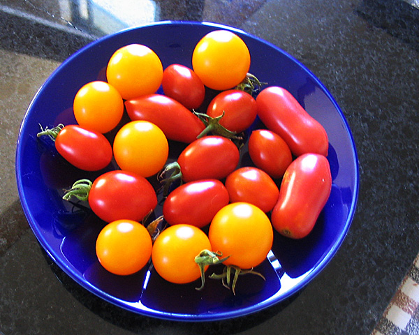 露地植え放置栽培なのでミニトマトだけだが、このところ暑すぎて実を回収する気にもなれん。黄色は苗を買って来たものから脇芽を再生させて5、6株にした。赤のティンカーベルは去年の実から取った種で大量に苗ができた。受粉の問題なのか一部に釣鐘型じゃない、丸型や徳利型など変形果も見られるが、まぁ、味は同じだ。売り物と違って完熟させているので異常に甘いが、皮がちょっと硬くなるのが難点かな? 売り物は緑のうちに収穫して紫外線でも当てるのだろうか?