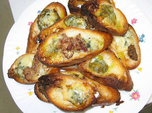 ブリッジ(トランプの)をしながら左手のみで食えるために開発されたサンドウィッチのように、仕事しながら食うセルフ賄いも、左手のみで食えるものと相場が決まっている。バゲット(Baguette:フランス・パン)をスライスして、既製の鴨や兎の味付け調整肉のリエットとブルーチーズを合わせ盛り、胡椒を挽いて250℃のオーブンで焼いたもの。もちろん、喉を潤すのはシラーの赤葡萄酒である。青カビチーズはゴルゴンゾーラでもいいが、安直な賄いにはデンマークあたりの名もないモノで十分。焼き上がったらオリーブ油を垂らす。上掛け用EXVオリーブ油は薫り立つ上級品であるに越したことはない。パンは硬いが、火が入っているから、歯を立てた瞬間粉砕される。硬さと香ばしさ、程々の塩分の塩梅、麦の香りこそがパンの旨さに他ならない。