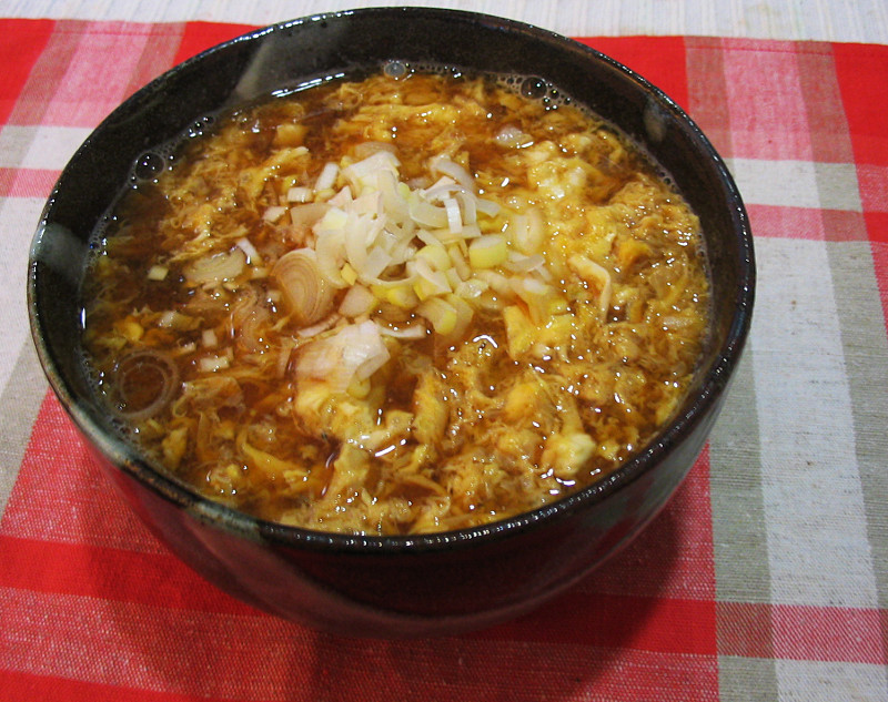 天麩羅は量販深夜半額見切り品で、下処理がなっちょらん穴子+売れ残りの鯵、或いは安直に桜海老、牛蒡、人参等で構成された“かき揚げ”。かき揚げは見事な真円で、直径10cm、高さ6cmほどという、専用のかき揚げリングとかき揚げレードルで作った感がありありと感じられるもの。セルフ・アレンジは大分のわけぎ、自家製葱(普通の白葱再生品)、自家製三つ葉。かき揚げの揚げ油は植物系で玉子無しと思われるが、中途でウンザリにして、ちょっと胸糞悪くなるしつこさが残る。トンカツや牡蠣フライの揚げ油を使い廻しているのか、パーム油や大豆油を用いているのだろう。蕎麦の天麩羅は揚げ立てでないほうがよい(むしろボッテリ衣で、油がしっかり切れるまで置いた、衣が硬い“つゆ耐性”が必要)が、ちゃんと胡麻油で揚げて欲しいよん。