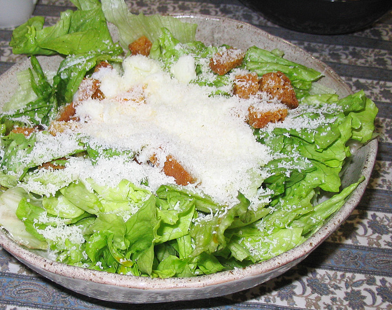 冷やした玉から葉を毟り、水洗後よく水気を拭きとって、大蒜を炒めたExVオリーブ油でしっかり和える。ルッコラやチコリ、バジル、スライスした生玉葱を加えてもいいだろう。塩、胡椒、リー&ペリンズで調味したら、大きめのレモン半個を搾り、温泉卵と事前に揚げておいたクルトンを加え、ExVオリーブ油をタラタラ。最後にゴリゴリとハードチーズを下ろす。パルミジャーノ・レッジャーノが本来だが、グラナ・パダーノやペコリーノ・ロマーノなど安価なもので代用することも多い。香りが飛ばなきゃ何でもいいか。チーズは高価だから量はどうしても少なめに誤魔化す。