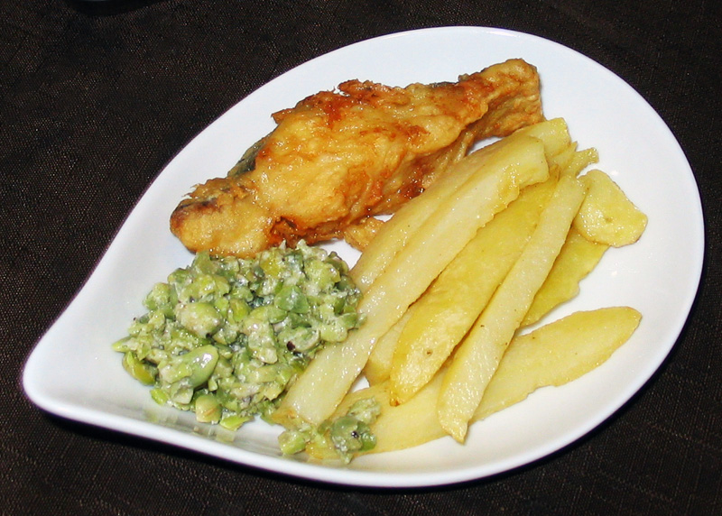 白身魚は冷凍の南氷洋産ホキ切り身。個あたり70g。衣は薄力粉と卵を冷えたビールで溶いて冷蔵庫で30分ほど置く。ホキは解凍後塩胡椒。滲み出た水分をよく拭き取って、薄力粉を叩く。準備ができたら180℃の油で揚げるだけ。マッシィ・ピーズ(Mushy peas)は自家製えんどう豆を刻み、大山無塩バターで炒め、岩塩+黒胡椒で調味、牛乳を少量加え、チリ産レモンを絞ったもの。レモン、Sarson'sのモルト・ヴィネガーを振ったものと交互に食う。