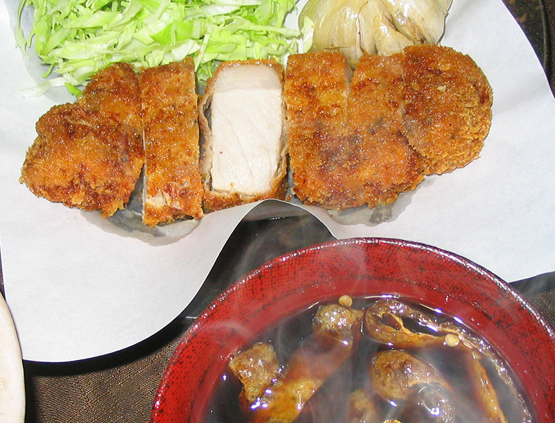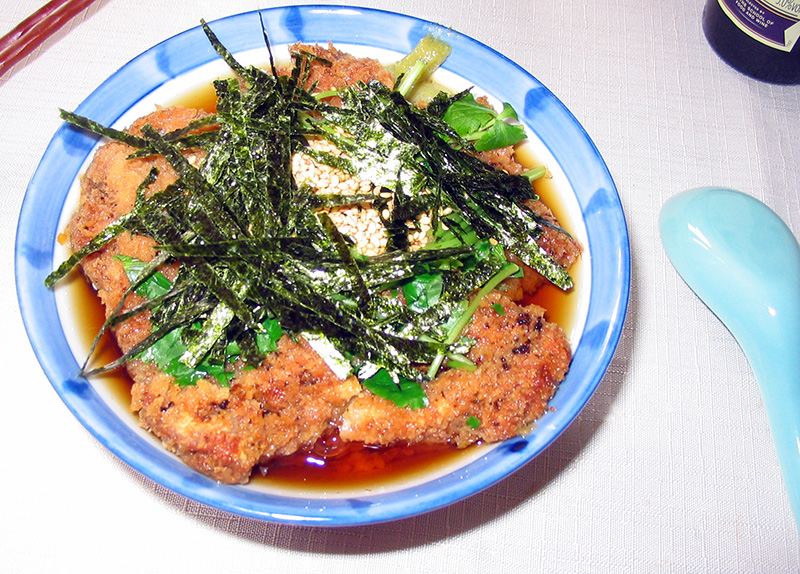 トンカツとトン茶は強い要望を受けてよく作る。安い北・南米産背肉を250g程度に切り分けて低温+高温で二度揚げする。トン茶の場合は半分の125gでもいいかな? 出汁つゆは鰹+昆布で。甘味は厳禁。醤油+塩で味付け。飯の上には鰹節と海苔1/4枚を敷いてカツを載せ、出汁つゆを回し入れる。
