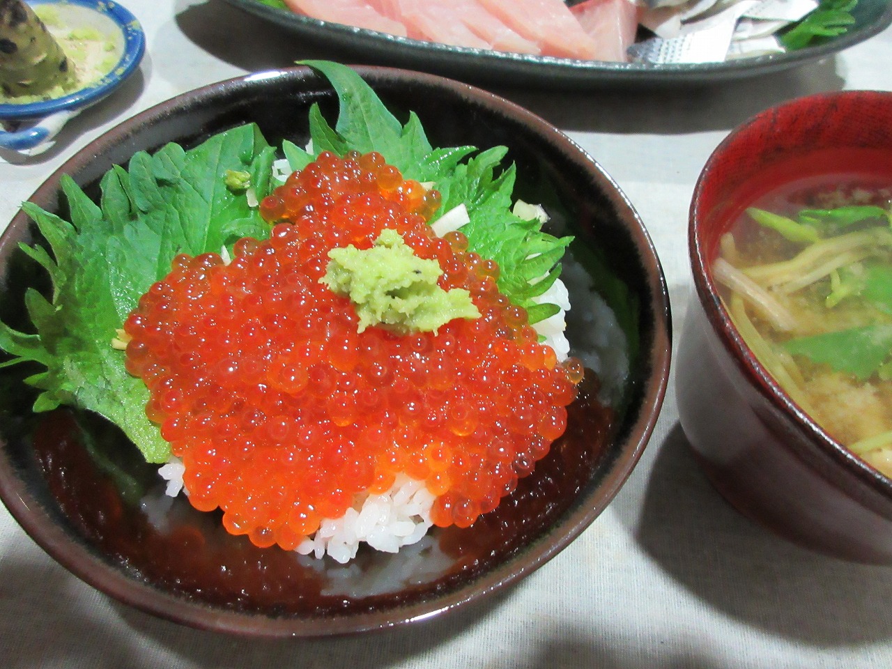 酢飯に青紫蘇か刻み海苔を敷いて、てろてろイクラいくらを流し、山葵を添える。酢飯といくらで塩分は十分なので余計なことはしないに限る。山葵は鮫皮で下ろすのが常道だが、どこへいったのか? 随分前から探しているんだが見つからん。