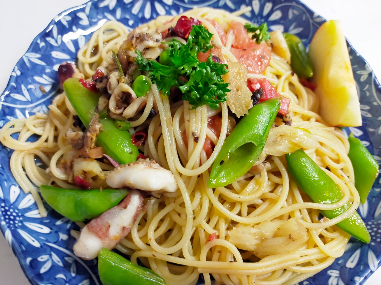 緑はスナップエンドウ、赤は生のトマトだったかな。パセリを散らせば出来上がり。麺はアニェージのスパゲティ。