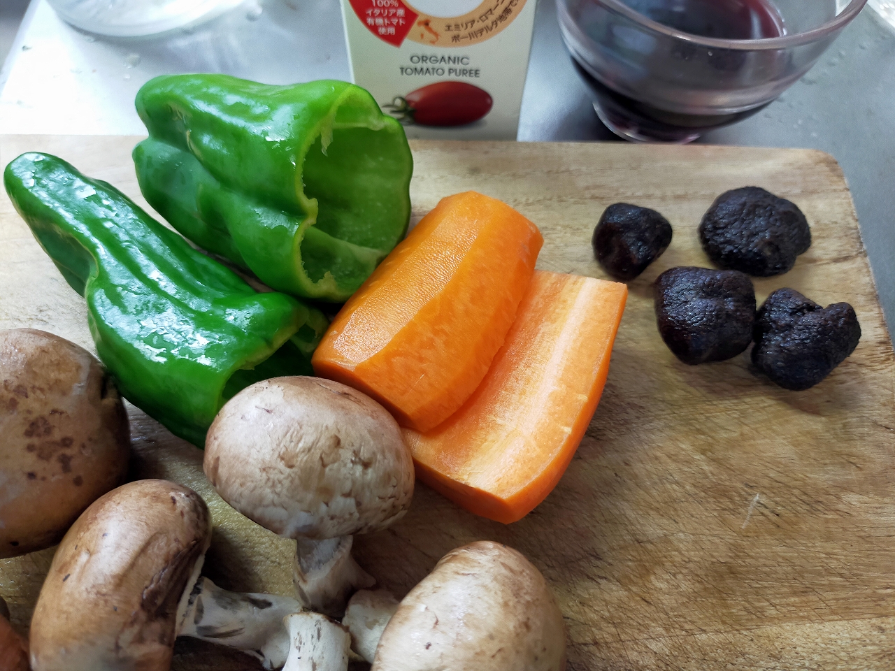 付け合せになりそうな具材は人参とピーマンしかないわ。ソースは和風でない場合ドゥミ・グラスが世間一般なのだろうが、あの甘くて隠蔽力に優れたハインツのデミグラが大手を振り過ぎで、それはちょっと違うのではないかと常々考えていた。大蒜、玉葱、ブナシメジを炒め、西洋松露をスライスしてたっぷり加える。フォン・ド・ボーを加えひと煮立ちで赤葡萄酒とアルチェ・ネッロのトマト・ピューレ100ccくらい。塩胡椒で調味して少し煮詰めてソースは完成。