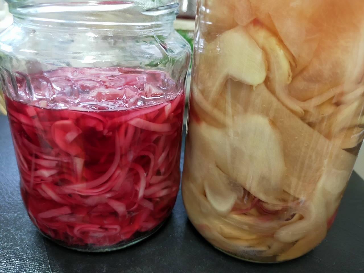 ご尤もで。今年は最終的に2kg弱を漬け込んだ。初夏の初回は150円/100g(写真)。夏に入ってからは80~100円/100gぐらい。甘酢生姜(ガリ)も紅生姜も安価に既製品が入手できるので、我ながらカッペ老の独りよがりな愚行にすぎないと思いつつ毎年拵えている。瑞々しい根っこを選んだら、流水に晒しながら爪で茶色い部分をこすり取る。赤い部分は色素になるのでなるべく残す。繊維方向に薄切りし沸騰したたっぷりの湯で再沸騰するまで湯掻き、ザルで水切り。冷めたらガリはそのまま甘酢調味液に、紅生姜用は刻んで赤梅酢に漬け込む。冷蔵数日で味が染み込んで良い塩梅になる。赤梅酢は梅干しを漬け込んだ副産物。